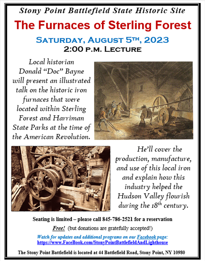 will present an illustrated talk on the historic iron furnaces that were located within Sterling Forest and Harriman State Parks at the time of the American Revolution. He’ll cover the production, manufacture, and use of this local iron and explain how this industry helped the Hudson Valley flourish during the 18th century