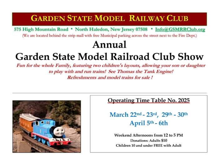 The Garden State Model Railway Club will open its doors once again for our Annual Spring Model Train Show! We will be running model trains of all kinds on our 1200 square foot HO scale layout, including Thomas the Tank Engine and his friends. There will be a special appearance on March 29th by John Rezuke’s Ringling Bros. Circus Train, and April 5th and 6th will feature the Golden Age of Steam!