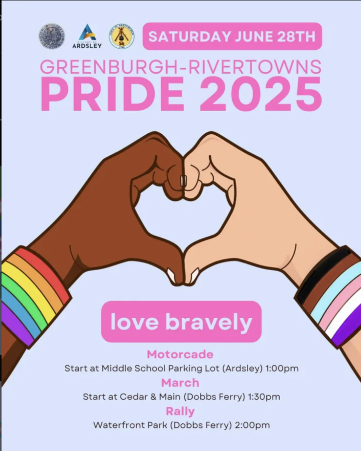 Ardsley School Parking Lot 700 Ashford Ave, Ardsley, NYJoin Dobbs Ferry for the Greenburgh-Rivertowns Pride Parade on Saturday, June 28. The celebration kicks off with a motorcade departing from the Ardsley Middle School parking lot at 1:00 PM, followed by a march starting at 1:30 PM at Cedar & Main in Dobbs Ferry. The event ends with a rally at Waterfront Park at…