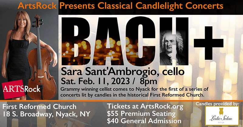 Saturday, February 11, 8:00pm First Reformed Church, Nyack More Info: ArtsRock.org Tickets: $55 Premium Seating, $40 General Admission GRAMMY-winning cellist Sara Sant’Ambrogio comes to Nyack for the first of a series of concerts lit by candles in the historical First Reformed Church of Nyack. The beautiful wood acoustics will ring with the music of Bach, including highlights…
