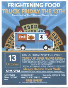 Experience the Sleepy Hollow RiverWalk with a special event this fall - "Frightening Food Truck Friday the 13th." Head to the RiverWalk on Friday, Oct. 13 from 5:00pm - 9:00pm for live music, food trucks and a visit from the Headless Horseman!