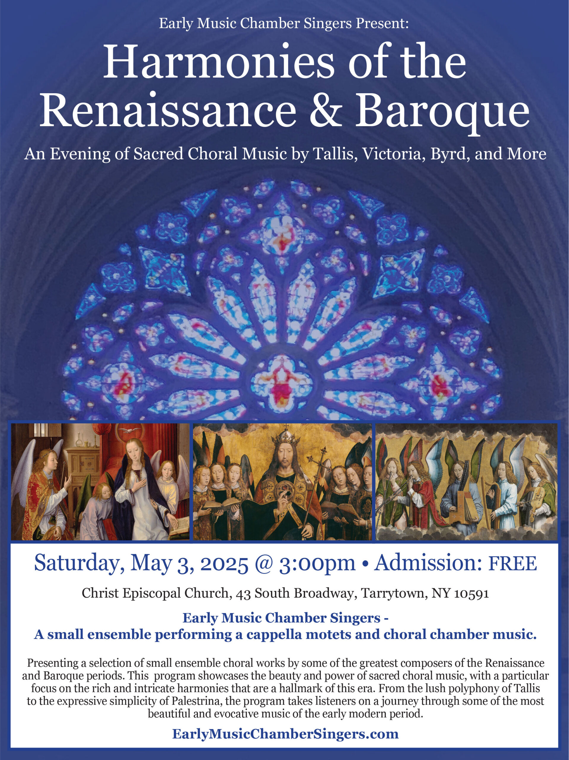 Christ Episcopal Chirch, Tarrytown 43 South Broadway, Tarrytown, NY, NY, United States"Harmonies of the Renaissance and Baroque": An Evening of Sacred Choral Music by Tallis, Victoria, Byrd, and more. The Early Music Chamber Singers under the direction of Lisa Kumaradjaja, presents "Harmonies of the Renaissance and Baroque": An Evening of Sacred Choral Music by Tallis, Victoria, Byrd, and More. This program showcases some of the most…