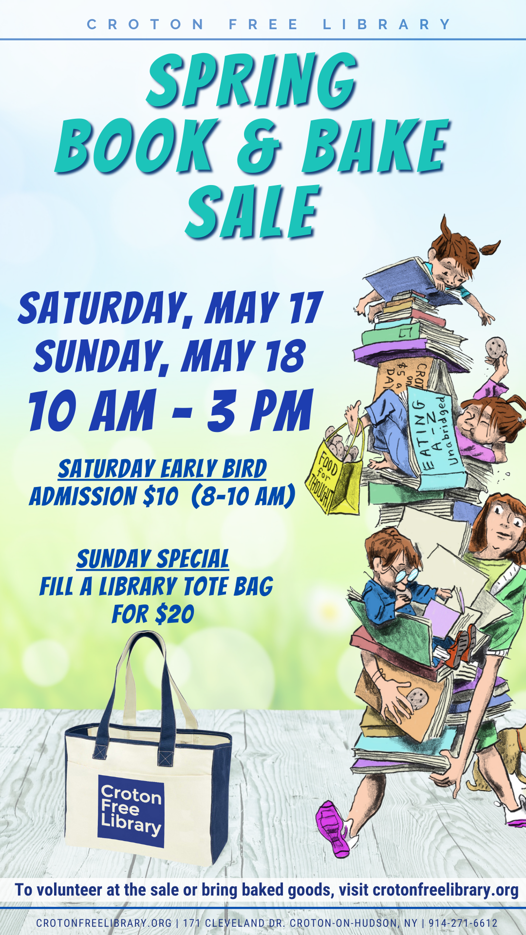 Croton Free Library 171 Cleveland Drive, Croton-on-Hudson, NYThe next Croton Free Library Book & Bake Sale will take place Saturday, May 17th and Sunday, May 18th from 10am-3pm (early bird admission will be from 8am-10am on Saturday for $10). Sunday is Fill a Library Tote for just $20 all Sunday! As in years past, the event will take place in the library’s…